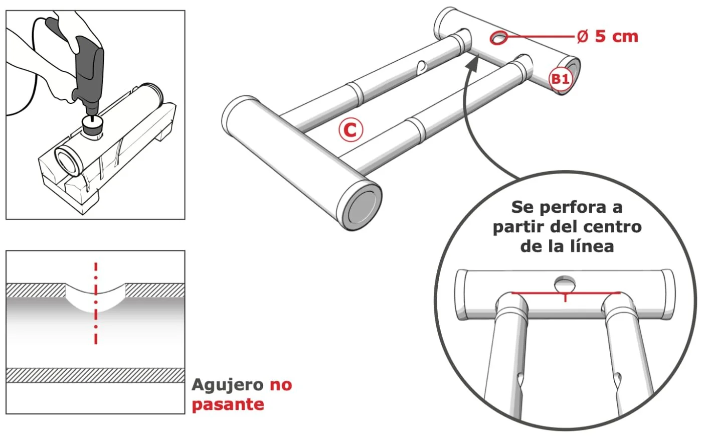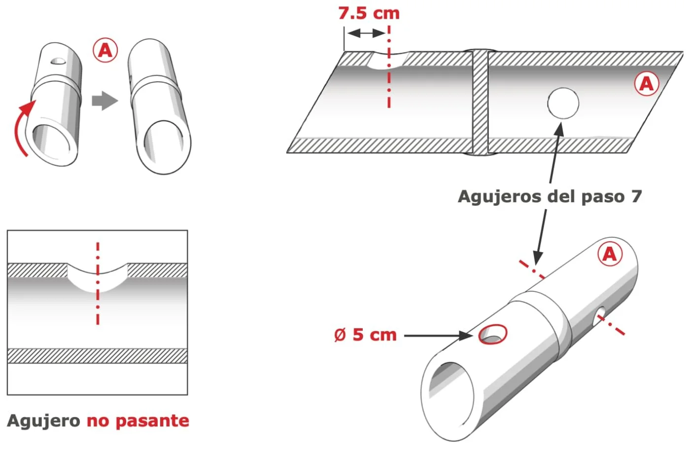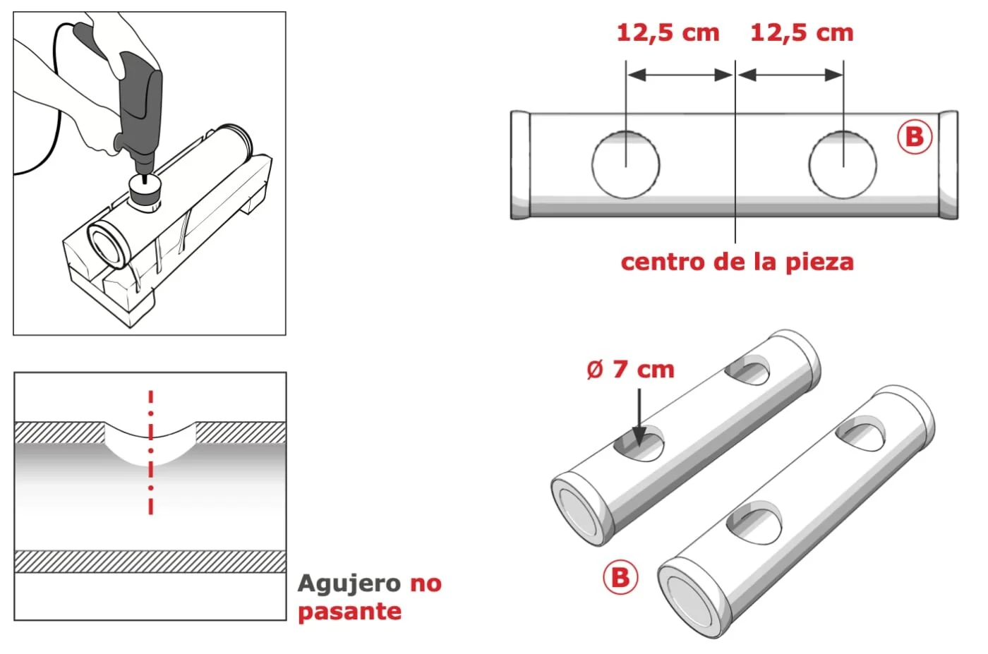 Se perforan dos agujeros en las piezas B con un diámetro de 7 centímetros y una separación de 25 centímetros.