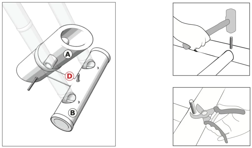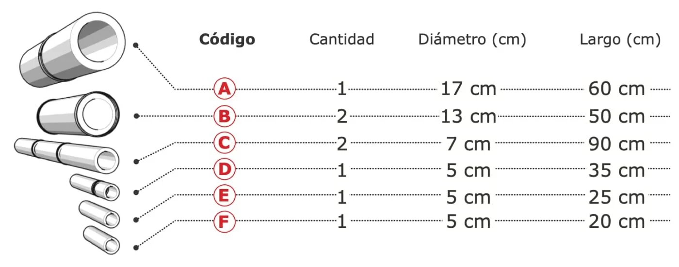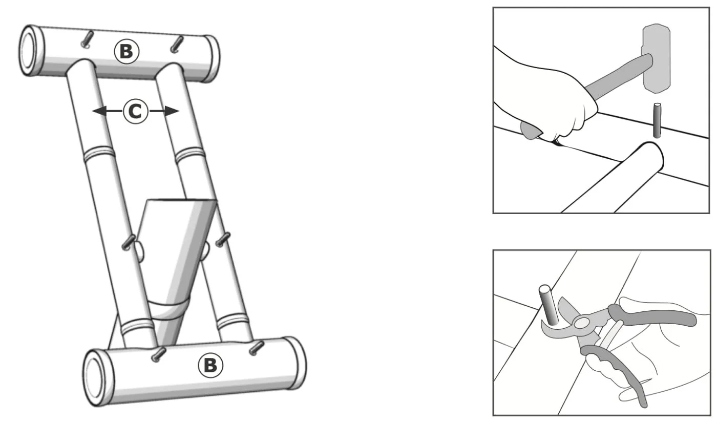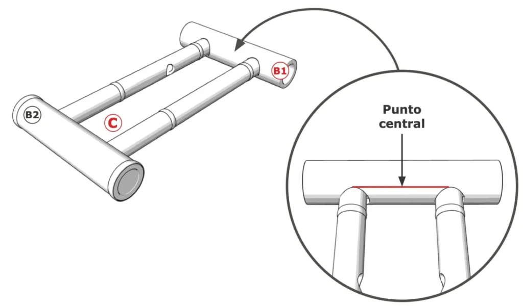 Se perforan dos agujeros en las piezas B con un diámetro de 7 centímetros y una separación de 25 centímetros.