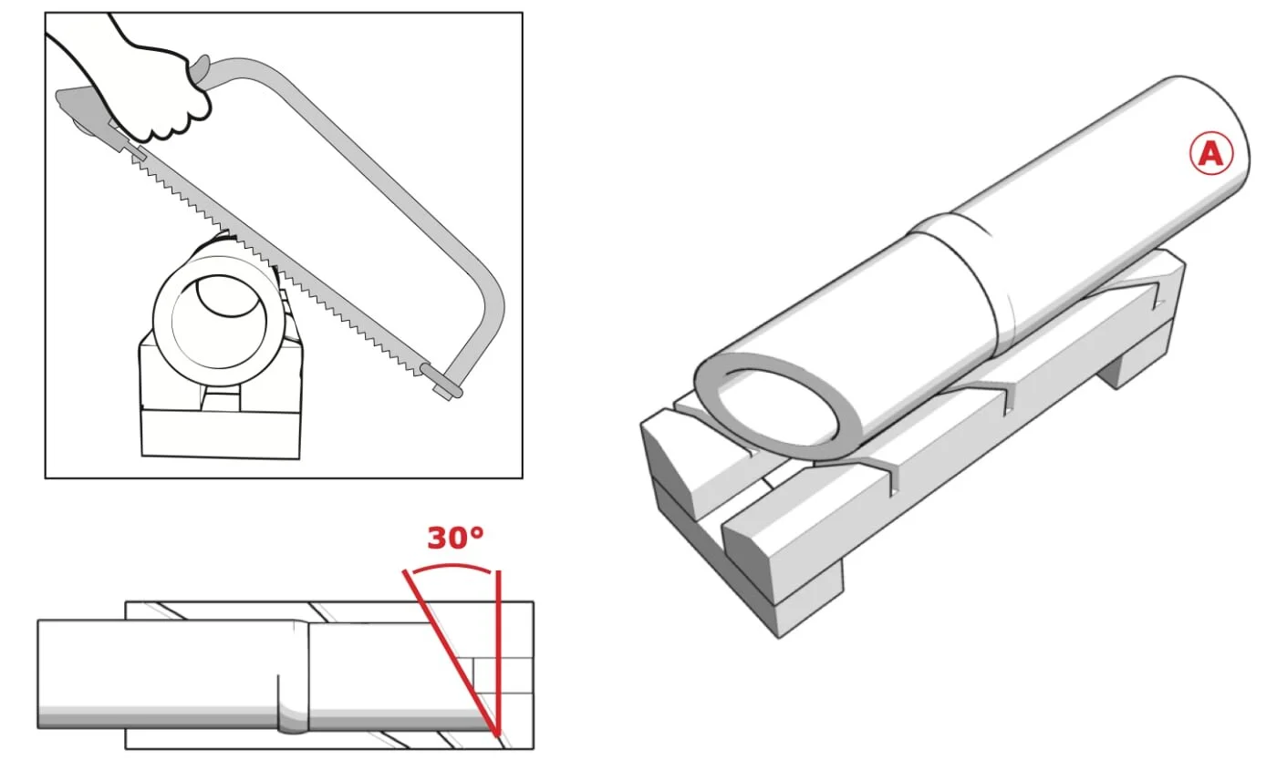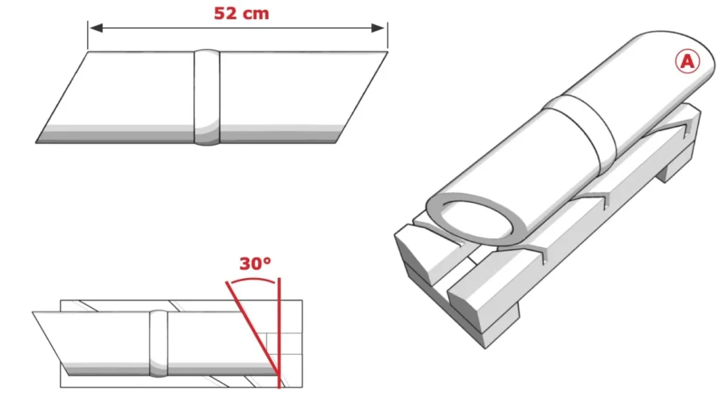 Se coloca el otro extremo de la Pieza A sobre el banco de trabajo y se corta con un ángulo de 30° a una distancia de 52 centímetros del corte anterior.