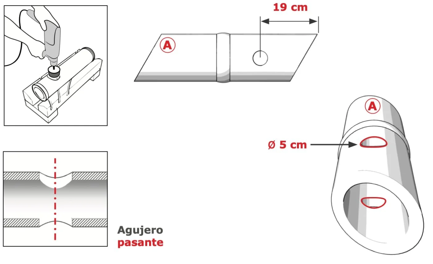 Se perfora un agujero que atraviesa las dos caras de la pieza A . El agujero debe tener un diámetro de 5 cm y su centro debe estar ubicado a 19 cm del extremo más alejado.