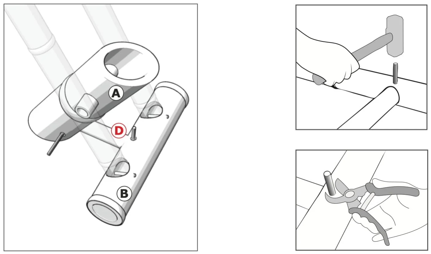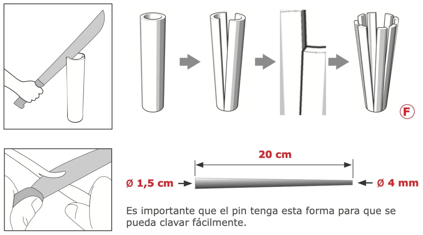 Se toma la pieza F y se segmenta a lo largo hasta tener como mínimo 8 partes. Estas partes se adelgazan para formar pines de 20 cm de largo y 1,5 cm de diámetro en un extremo y 4 mm en el otro extremo.