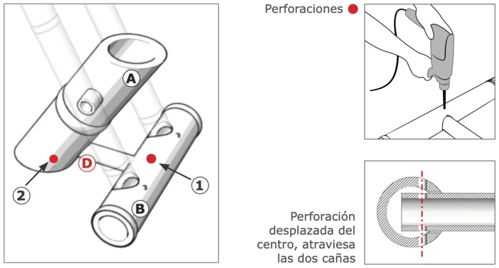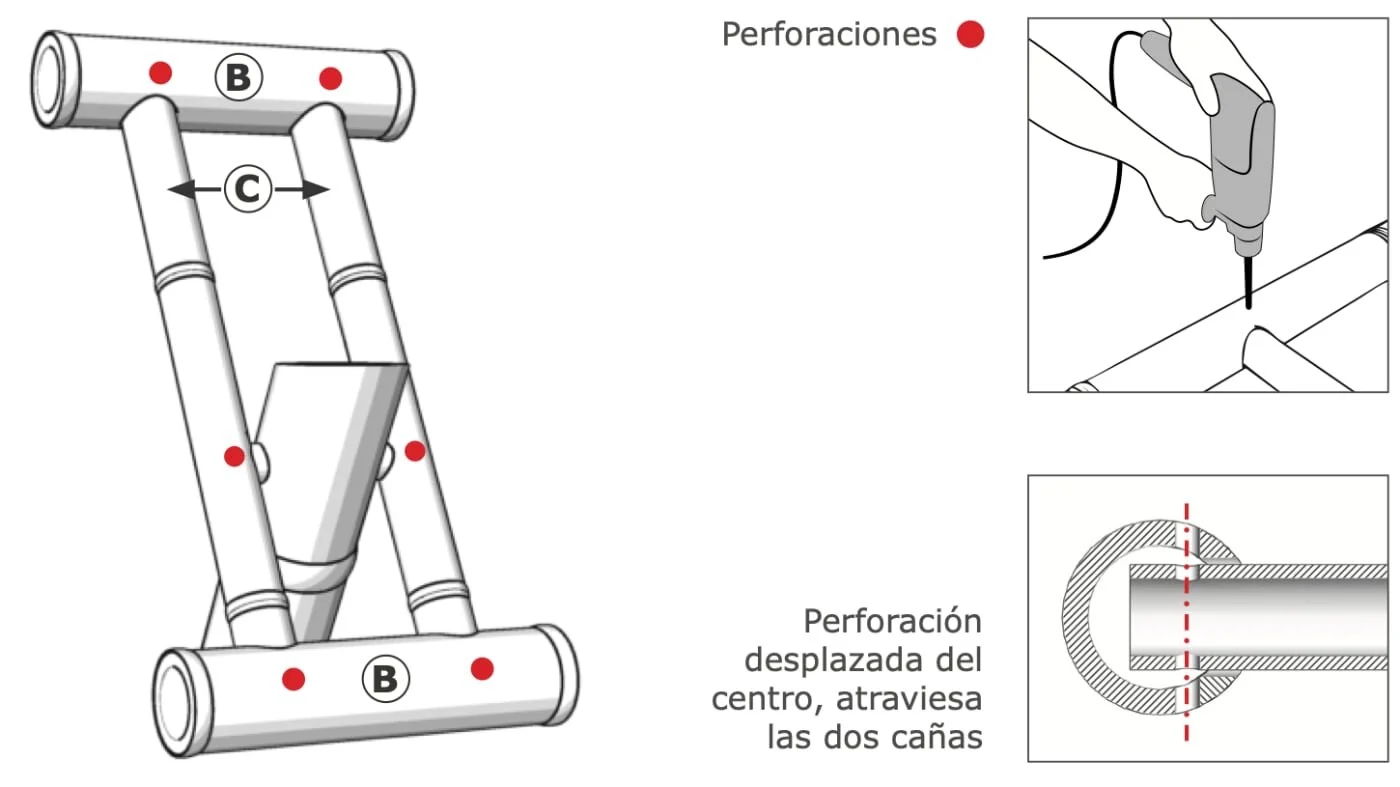 Se hacen 6 perforaciones de aproximadamente 8 mm de diámetro que atraviesan la unión entre las piezas B – C y C – E . El agujero se debe perforar hacia la unión y no en el centro del bambú.