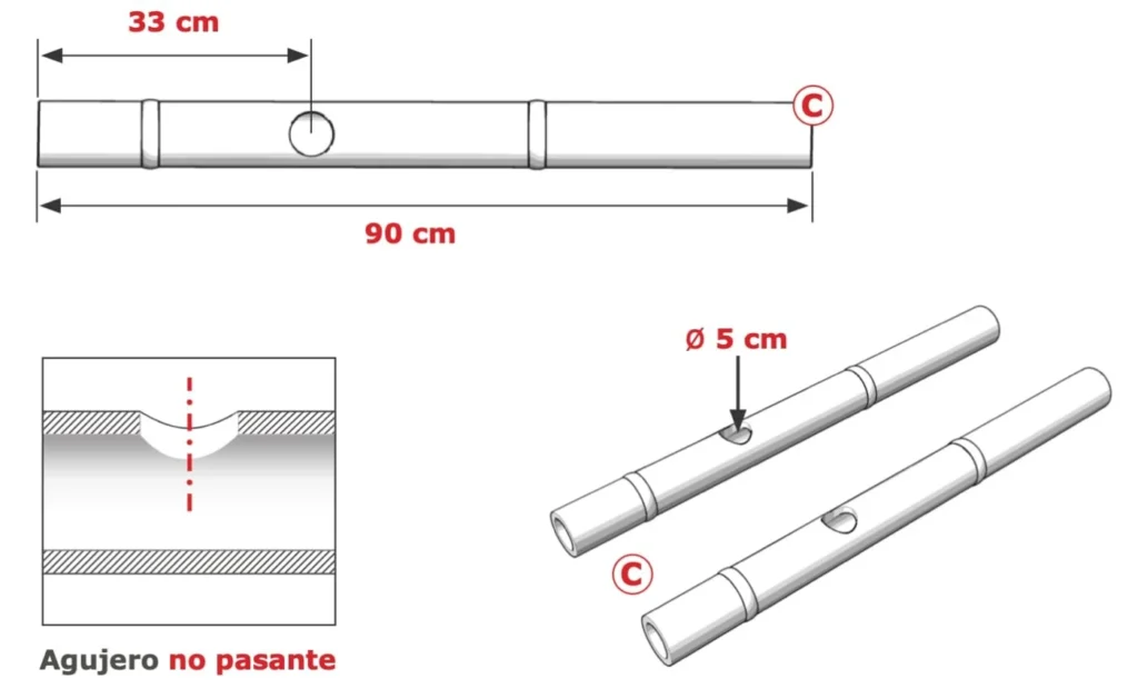 Se perfora un agujero en las piezas C con un diámetro de 5 centímetros y una distancia de 33 centímetros respecto al extremo más cercano.