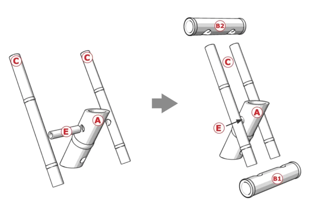 Se coloca la pieza E a través de los agujeros laterales de la pieza A, luego se colocan las piezas C y por último las piezas B.