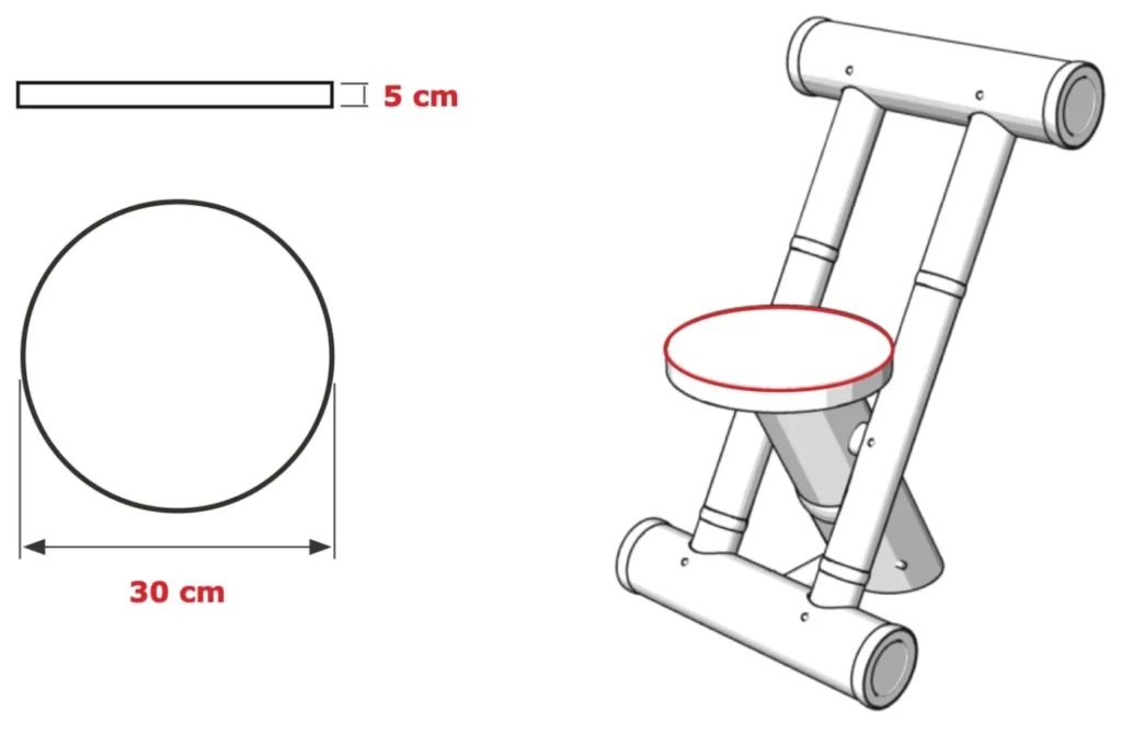 El asiento se recomienda que sea en madera con un grosor de 5 centímetros y un diámetro de 30 centímetros. Pueden utilizarse piezas de madera sin tratar con la forma natural del árbol.