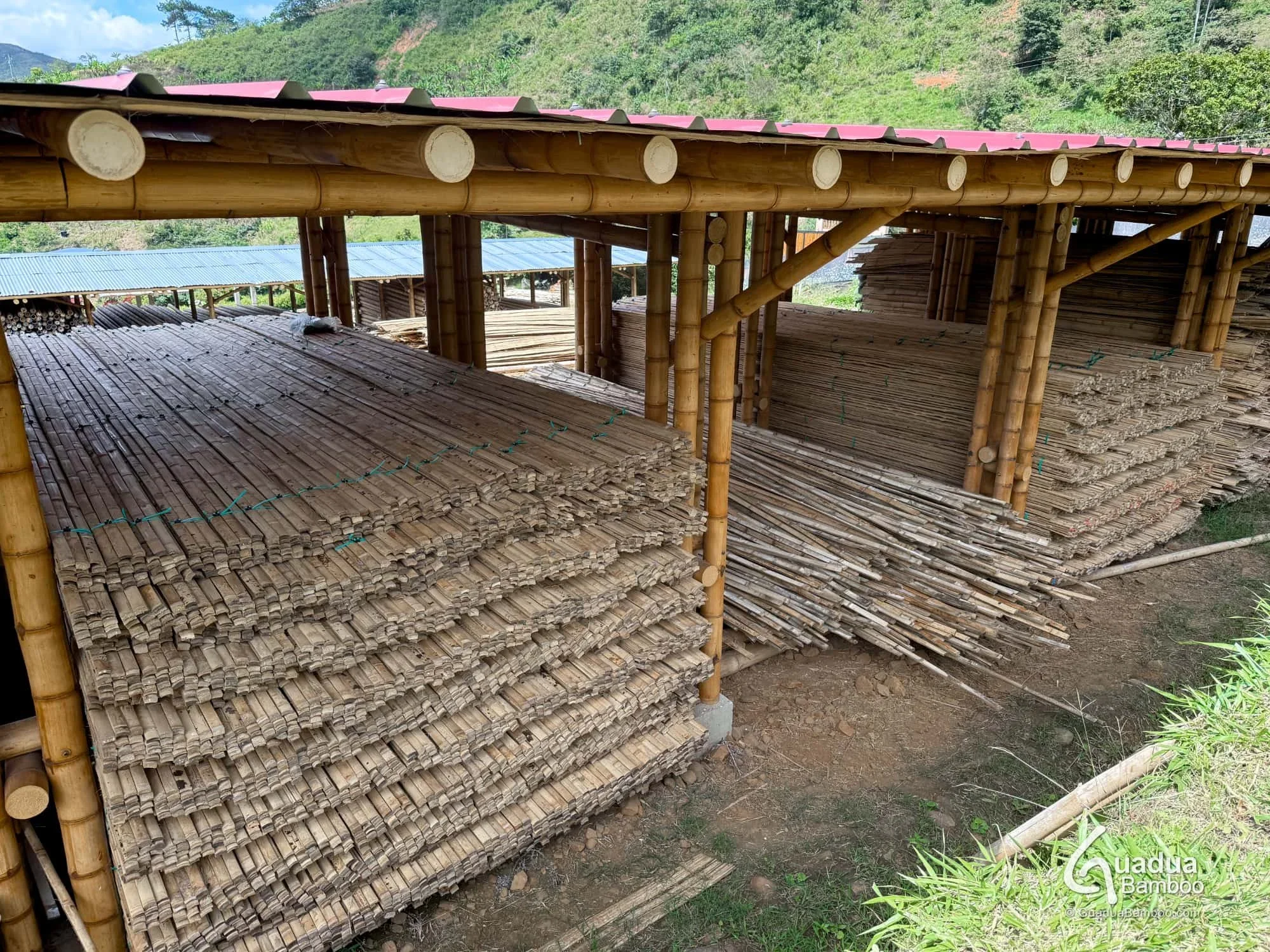Cada lámina inicia su recorrido como una caña madura de Guadua, seleccionada por su resistencia y uniformidad. Tras la cosecha, los culmos se cortan, parten y perfilan en láminas estandarizadas. Posteriormente, estas láminas son tratadas contra plagas y hongos, garantizando una durabilidad estructural a largo plazo.