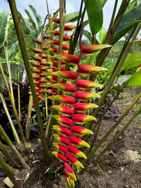 Heliconia rostrata desarrolla un follaje exuberante con hojas grandes y brillantes. Sus inflorescencias colgantes pueden alcanzar hasta 60 cm de longitud, formadas por brácteas rojas con bordes amarillos o verdes, de donde emergen pequeñas flores verdaderas. Florece varias veces al año en condiciones cálidas y húmedas, y forma macollas densas con un fuerte valor decorativo. Es una planta llamativa que aporta movimiento y color a cualquier espacio tropical.