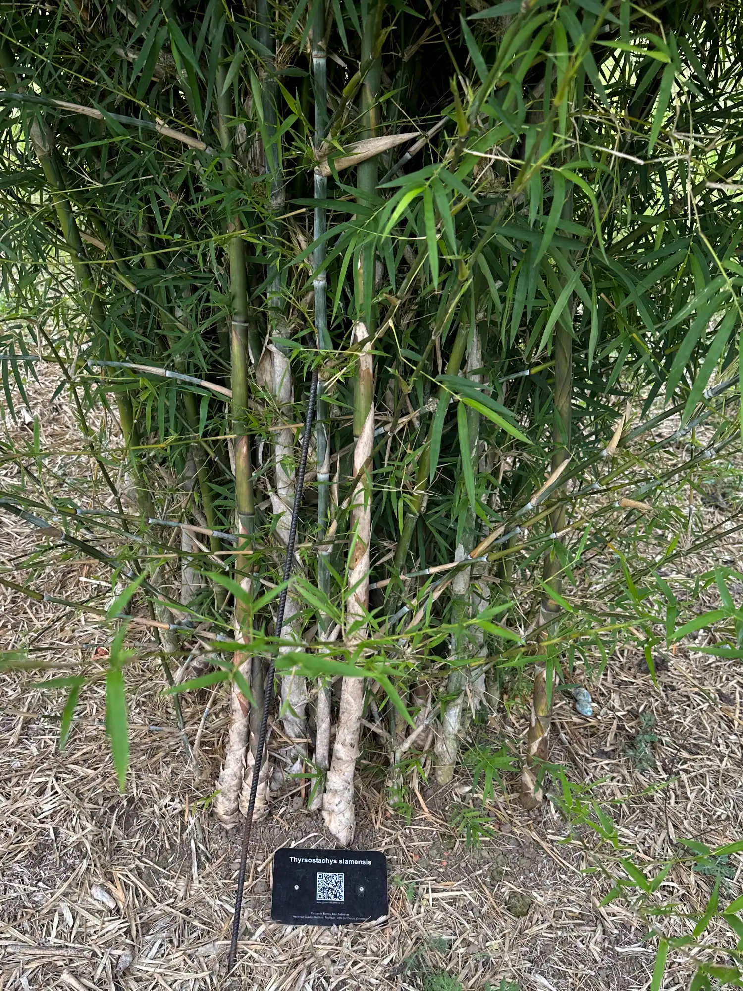 El Thyrsostachys siamensis forma grupos compactos de cañas erectas que crecen muy juntas, casi sin espacio entre ellas, creando un efecto de muro natural. Sus culmos son rectos, lisos y de color verde a dorado, con paredes muy gruesas (hasta macizo) y gran resistencia. A diferencia de muchos bambúes medianos, su crecimiento es más controlado, lo que facilita su manejo en espacios reducidos. Las hojas son pequeñas, finas y de un verde intenso, lo que realza su valor ornamental.