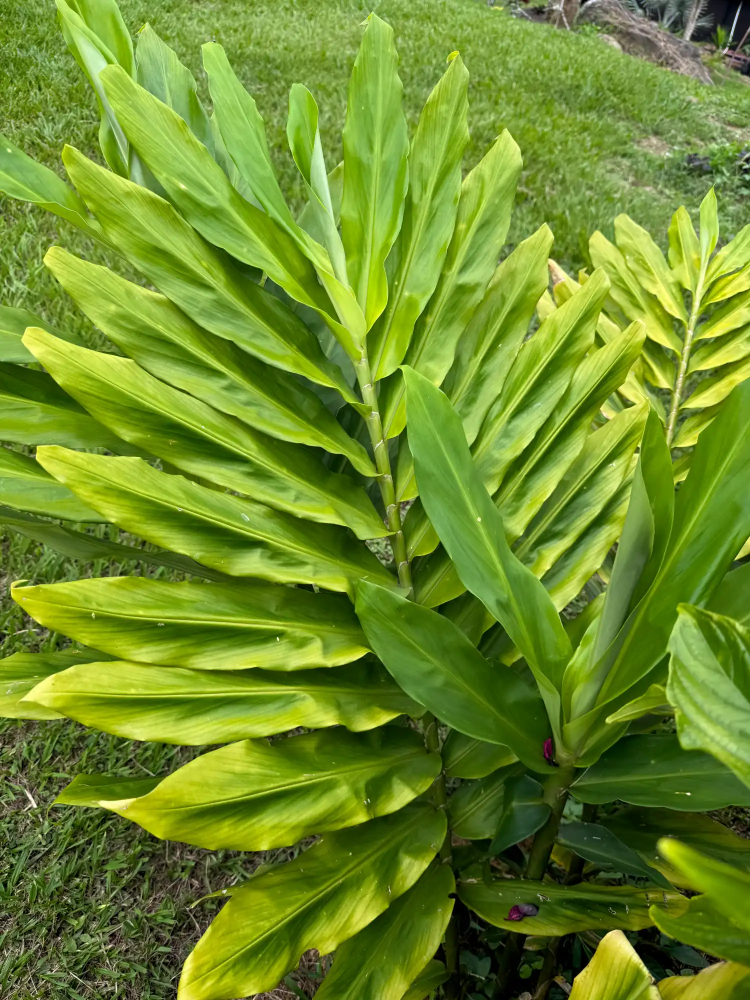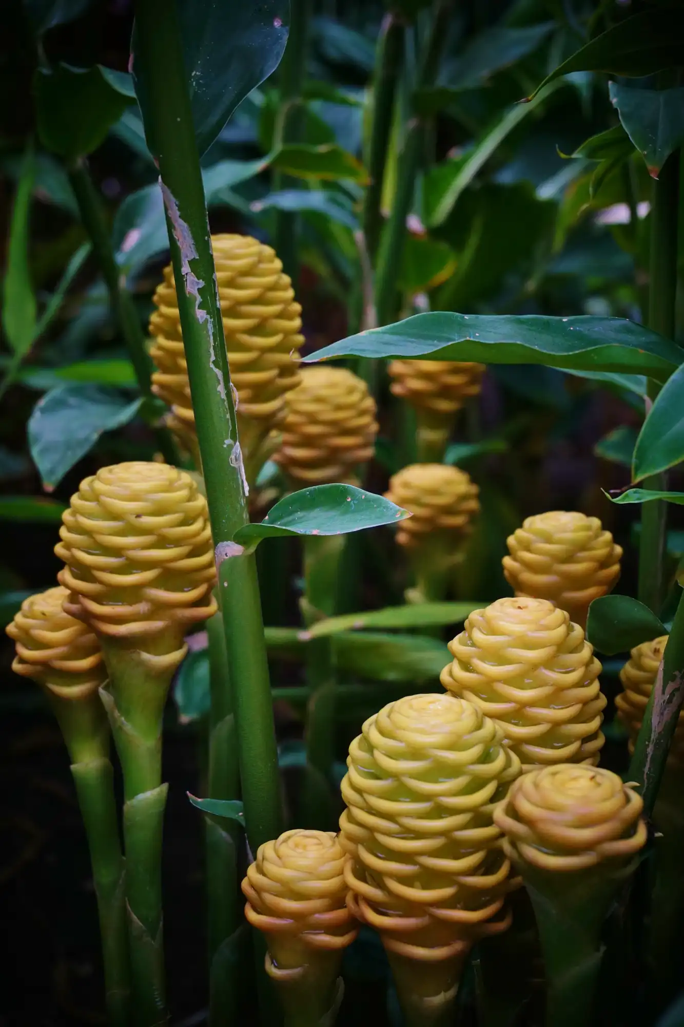 La Zingiber spectabile se destaca por sus tallos largos y hojas de color verde intenso que nacen desde la base. Pero el verdadero espectáculo ocurre a nivel del suelo o a media altura, donde brotan sus famosas “maracas”. Estas estructuras son muy rígidas, de textura cerosa y pueden durar varios meses en la planta, cambiando de color con el paso de las semanas.